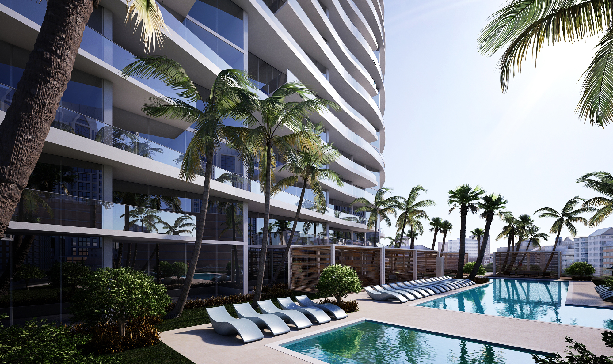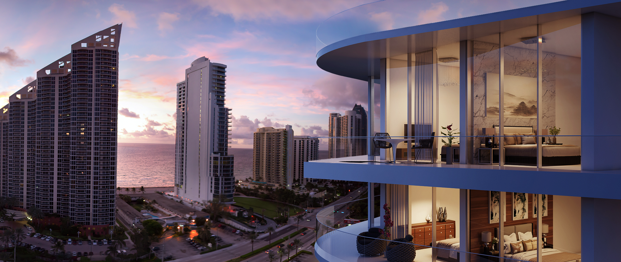 Aurora is a luxury, 17 story condo located in Sunny Isles Beach. Located minutes away from the beach, these 61 boutique residences stay true to the idea of luxurious South Florida living. Curated in 2 & 3 bedroom layouts, each space is created with open-floorplans keeping each residence welcoming and spacious. A world-class selection of finishes and interior touches is provided by renowned interior designer Steven G. Interiors who has designed the interior spaces of the building. The outer facade of Aurora provides each residence with its own expansive curved balcony space, so residents can enjoy some of the fresh ocean breeze. The curvature of the outer balcony spaces designed by architect Revuelta Architecture International makes Aurora stand out as a unique building in the Sunny Isles area.